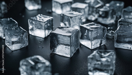 Ice Cubes: A Close-Up View of Sparkling, Translucent Ice Cubes on a Dark Surface