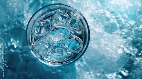 Ice cubes in a glass of water with ice cubes on blue background