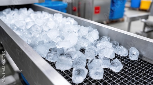 ice cube, ice, conveyer belt, industrial, manufacturing, production, food processing, glacé, cold, chilling, refrigeration, factory, machine, metal, automated, processing, conveyer, food industry, freezing, cube, water, commercial, fresh, cooling, stainless steel, cold storage, preserving, frozen food