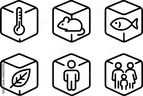 Ice Cubes Vector Icons With Symbolic Objects Inside Thermometer Mouse Fish Leaf Human Family