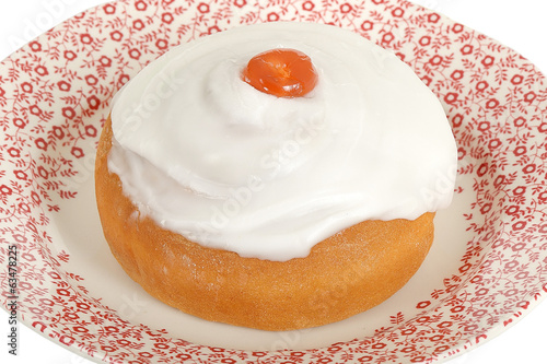iced, bun, glazed, cherry, dessert, cake, sweet, treat, icing, food, isolated, white, background, cut-out, clipping path, closeup, nobody
