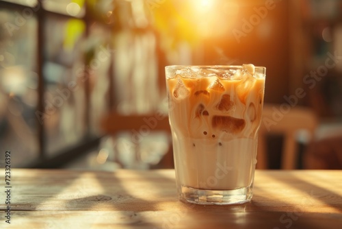 Iced coffee with milk and cream Cold brew with ice Morning sunlight