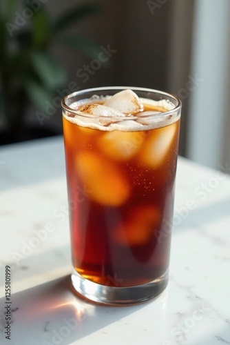 Iced cold brew coffee in glass, white marble table, marble, cold brew, ice