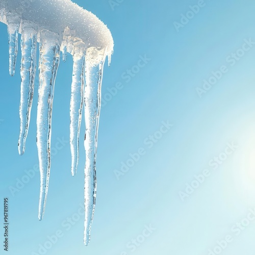 Icicles hanging from rooftops, glistening in sunlight, 3D illustration, copy space for text,