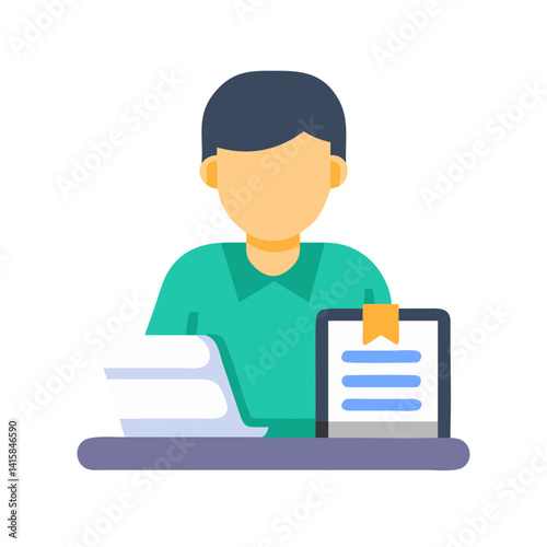 icon, men at work, desk, computer, laptop, paperwork, document, office, business, work, job, task, assignment, student, studying, study, learning, education, male, person, man, clipboard, file, employee, workplace, employment, corporate, vector, illustration, graphic, design, cartoon, flat, table, workspace, freelancer, entrepreneur, technology, research