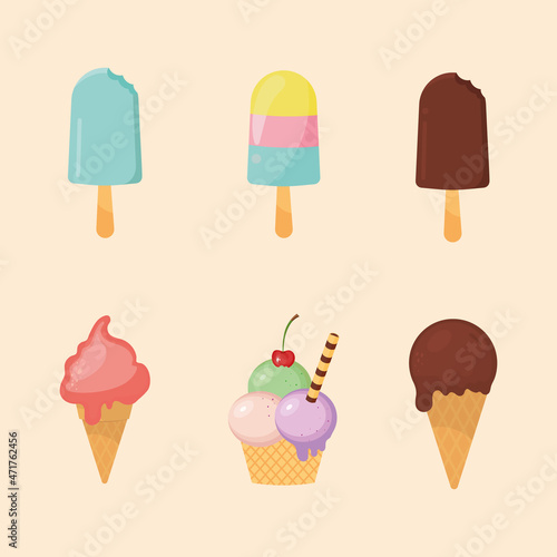 ice, cream, stick, cone, icon, dessert, food, waffle, sweet, favor, cream, glacé, snack, cold, product, tasty, scoop, chocolate, collection, dairy, vanilla, delicious, soft, refreshment, vector, illustration, design, set