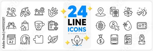 Icons set of Coffee, Passport document and Ssd line icons pack for app with Pin, Spanner, Money bag thin outline icon. Vocabulary, Report document, Safe box pictogram. Lake. Vector