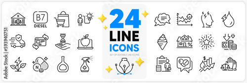 Icons set of Medical drugs, Court jury and Vitamin n line icons pack for app with Eco power, Accounting, Transport insurance thin outline icon. Cognac bottle, Stress, Ice cream pictogram. Vector