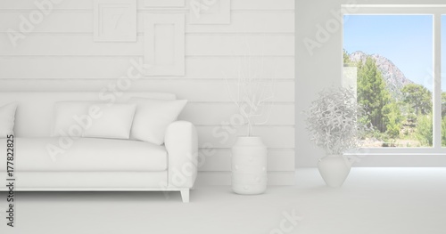 Idea of white room with sofa and summer landscape in window. Scandinavian interior design. 3D illustration
