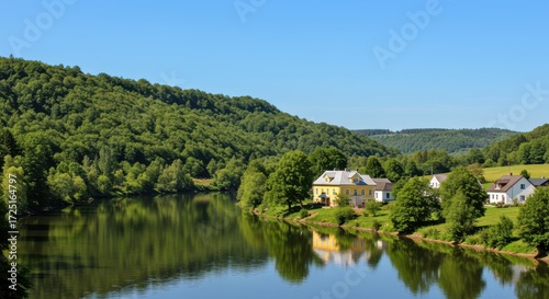 house, home, rural, landscape, nature, water, lake, river, shore, bank, tree, forest, hill, mountain, green, summer, sunny, day, blue, sky, cloudless, calm, serene, peaceful, tranquil, scenic, beautiful, idylli, picturesque