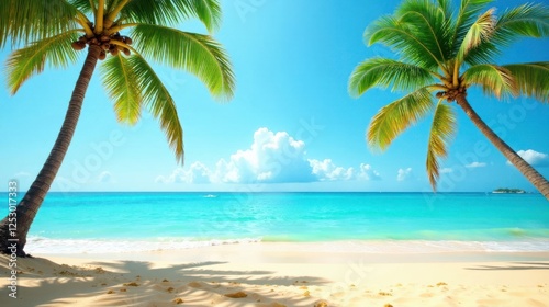 Idyllic Tropical Beach Scene Two Majestic Palm Trees Frame a Pristine Shoreline, Turquoise Waters, and a Tranquil Sky