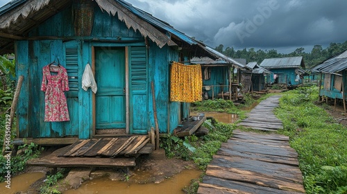 village, rural, house, wooden, pathway, weathered, turquoise, clothing, overcast, community, architecture, thatched, dwelling, boardwalk, landscape, impoverished, settlement, developing, home, traditional, plank, tropical, exterior, apparel, residence, garment, laundry, humble, simple, peaceful, scenery, quiet, tranquil, southeast, asia, habitat, rustic, old, culture, lifestyle, local, tour tourism