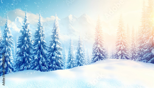 Idyllic winter wonderland scene; snow-covered fir trees, majestic mountains, falling snow, soft sunlight. Perfect for Christmas, winter holidays, or nature themes.