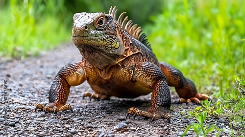 Iguana Lizard Reptile Animal Close Up Walking on Gravel Path Green Grass
