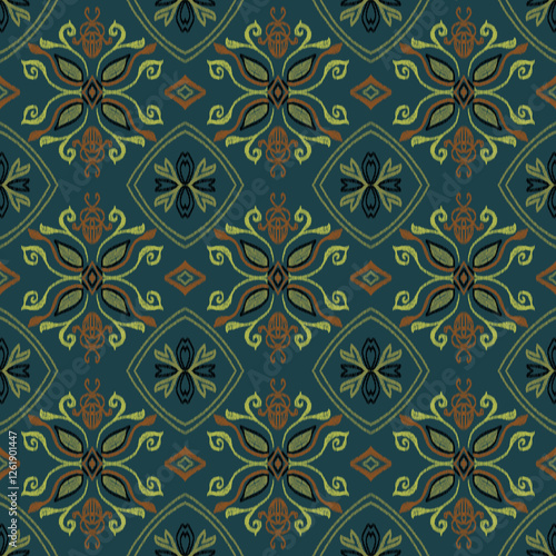 Ikat pattern, colorful floral pattern, seamless, green flowers with black edges and yellow and brown tentacles. In a green diamond vine frame On a dark turquoise background