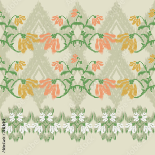 Ikat woven fabric pattern is a traditional seamless orange and white floral shawl or sash, on a pale yellow background.