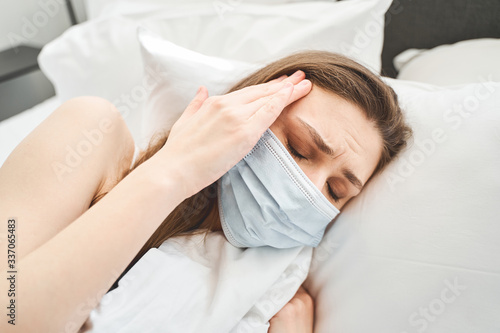 lying, having, severe, cephalalgia, sick, diseased, ill, disposable, protective, face, mask, blanket, duvet, bed, bedchamber, quarantine, isolation, virus, disease, disease, acute, viral, respiratory, infection, woman, girl, female, lady, 1, person, alone, young, adult, caucasian, blond, indoor, home, closeup, portrait