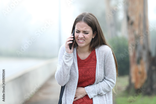 Ill woman suffering belly ache calling on phone in a park