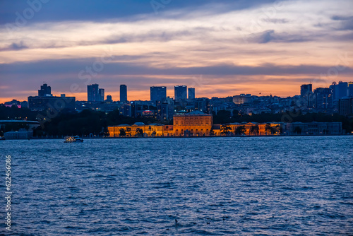 Illuminated architecture Dolmabahce Palace. Night view of istanbul city and skyscrapers. Awesome Panoramic view of Istanbul Bosphorus on night.