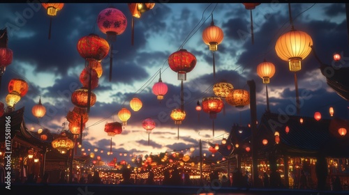 lantern, street, asian, night, colourful, illuminated, festival, celebration, market, shop, building, evening, dusk, twilight, sky, cloud, red, orange, yellow, light, glow, hanging, traditional, culture, chinese, japanese, korean, vibrant, festive, beautiful, scene, architecture, crowd, people, atmosphere, ambience, warm, magical, mystical, serene, peace, calm