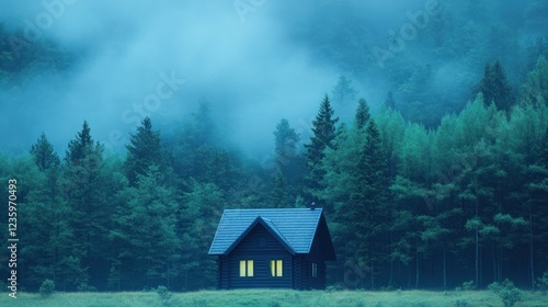 cabin, forest, mountain, night, misty, illuminated, house, tree, fog, wood, nature, landscape, bungalow, home, wilderness, scenic, dark, peaceful, serene, tranquil, remote, solitude, mystery, escape, retreat, relaxation, calm, quiet, seclusion, haven, sanctuary, shelter, timberland, evergreen, coniferous, pine, fir, spruce, outdoors, environment, ecology, travel, adventure, exploration, vacation, holiday