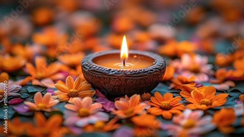 Illuminated candle amidst orange flowers; peaceful ambiance; meditation; spiritual; wellness