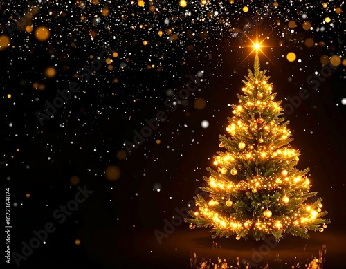 christmas, tree, light, gold, dark, sparkle, snow, night, holiday, festive, decorated, ornament, shining, vibrant, beautiful, winter, glowing, celebration, illuminated