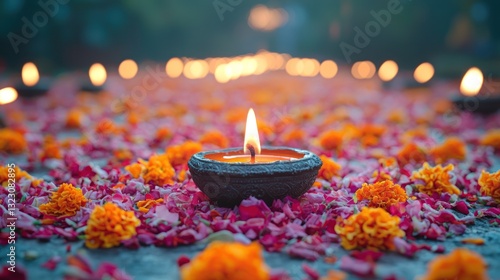 candle, light, flower petals, flower, marigold, rose, orange, pink, red, yellow, warm, glow, flames, fire, spiritual, meditation, peace, serenity, calm, tranquil, hope, faith, prayer, devotion, religious, festival, celebration, india, culture, tradition, beauty, aesthetic, romantic, harmony, soft, sharpened, background, blur, path, row, night, dark, scene, image, photo