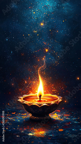 Illuminated Diya Festive Diwali Spiritual Light Glowing Flame Mystical Dark Background Golden