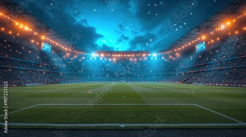 illuminated, football, stadium, fan, evening, match, under, bright, artificial, light, empty, grass, pitch, night time, sport, venue, serene, atmosphere, await, soccer, event, seating, goalpost, spectator, area, floodlight, arena, competition, turf, large, professional, seat, anticipation, quiet, architecture, grandstand, dusk, twilight, preparation, leisure