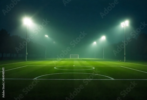 Illuminated football stadium field at night shrouded in thick fog. Bright lights create eerie, moody atmosphere on empty soccer pitch for dramatic sports scenes.