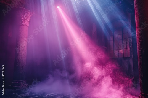 hallway, column, window, fog, light, beam, purple, blue, dark, dramatic, atmosphere, dimly, lit, single, bright, room, interior, stone, old, vintage, architecture, design, abstract, background, structure, texture, shadow, contrast, colours, pattern, mood, style, effect, art, photo