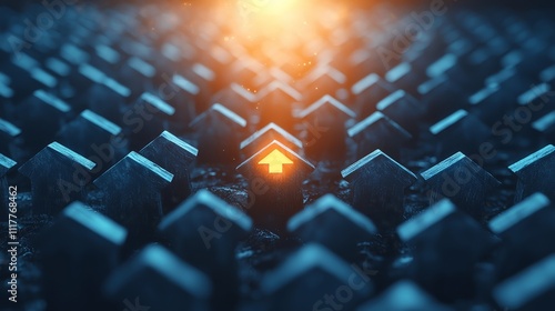 Illuminated House Among Dark Home Shapes Symbolizing Unique Choice and Distinction in Housing Market Conceptual Imagery