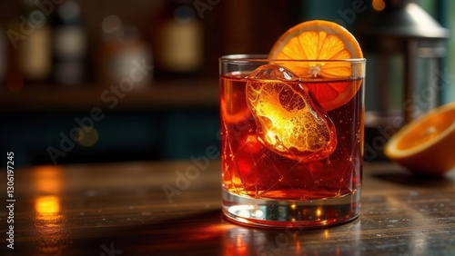 cocktail, drink, beverage, liqueur, alcohol, bar, pub, eatery, ice, orange, citrous, slice, glasses, amber, blood-red, dark, wood, surface, table, illumination, refreshment, nightlife, cold, bubbly