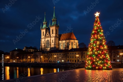 Illuminated Krakow basilica, festive Christmas tree at night , celebration, basilica