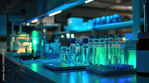 Illuminated laboratory workbench with test tubes, bottles, and equipment.