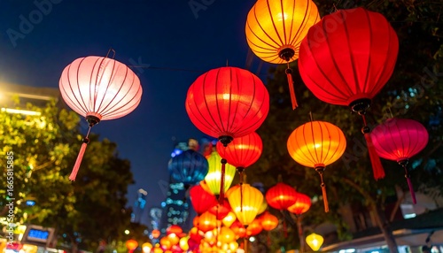 Illuminated lanterns hang in a nighttime cityscape, creating a vibrant and festive atmosphere