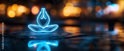 Illuminated mindfulness: A glowing yoga pose amidst urban nightscape