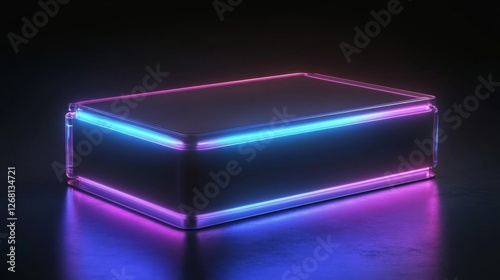 Illuminated Neon Rectangle Box with Glowing Edges on Dark Reflective Surface