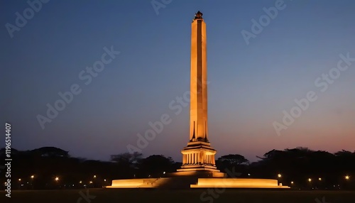 obelisk, historical building, column, pillar, tall, structure, night, twilight, evening, dusk, sky, light, illuminated, glowing, orange, warm, stone, architecture, design, majestic, grand, impressive, serene, peaceful, calm, dark, shadow, tree, park, landscape, setting, sun, sunset, background, beautiful, scenery, city, urban, outdoors, travel, photo