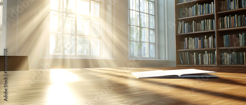 Illuminated open book on wooden table serene library photography natural light interior view knowledge reflection
