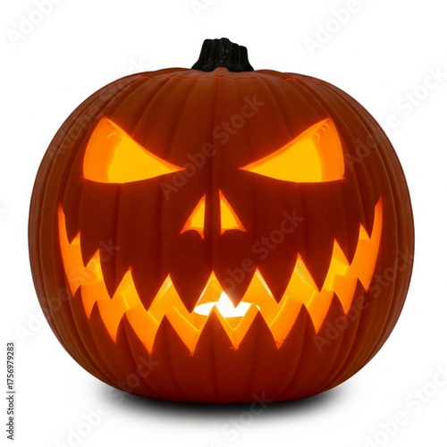 Illuminated Orange Halloween Pumpkin with Carved Scary Face on White Background