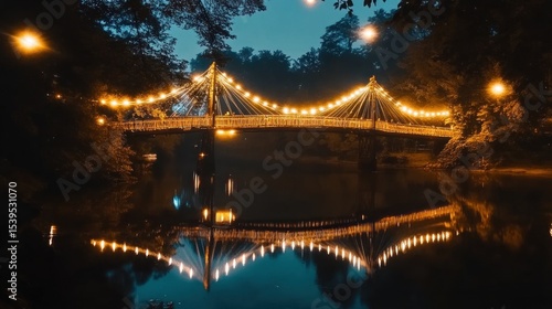 bridge, park, night, illuminated, light, water, river, tree, scenic, beautiful, evening, tranquil, nature, urban, landscape, quiet, peaceful, charming, romantic, historic, nostalgia, glowing, gold, dusk, dawn, serene, misty, foggy, city landscape, architecture, city, parkland, calm, dark, golden hour, lighting, cable, suspension, photo, beauty, pretty, view