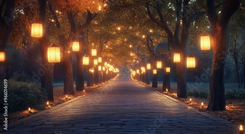 Illuminated path lined with lanterns among autumn trees in a tranquil park at night