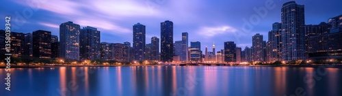 skyscraper, building, city, city landscape, lake, water, dusk, twilight, night, urban, skyline, architecture, glasses, concrete, modern, light, illuminated, window, street, horizon, calm, peaceful, quiet, tranquil, serene, dark, blue, purple, pink, orange, glow, mood, photo, image, photograph, photo, chicago, metropolis, downtown, view, river, street light, street light, long, exposure, soft, sharpened