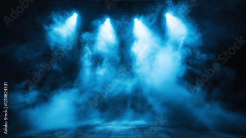 Illuminated stage with scenic lights and smoke. Blue spotlight with smoke volume light effect on black background. Stadium cloudiness projector
