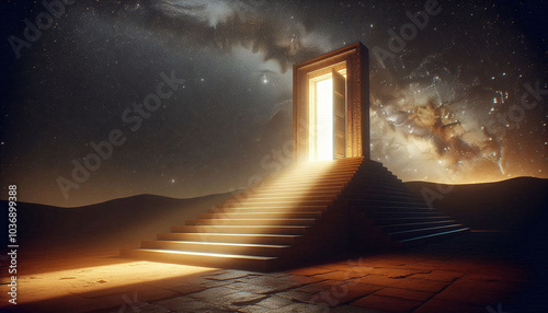 staircase, light, open, door, desert, night, sand, dune, star, sky, surreal, mystical, dreamlike, illuminated, bright, portal, wonder, intrigue, landscape, nightscape, rolling, huge, adventure, journey, glowing, entrance, night time, starry sky, magic, sand, illumination