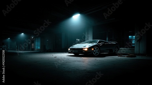 Illuminated supercar abandoned garage photograph low light side view high-contrast realism
