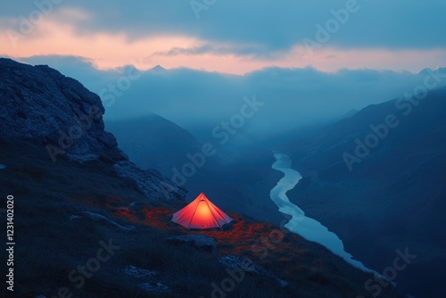 mountain, tent, landscape, river, vale, dusk, night, camping, adventure, nature, travel, scenic, view, sunrise, sunset, sky, cloud, rock, hill, wilderness, exploration, journey, freedom, peace, serenity, solitude, calm, quiet, dark, light, glow, orange, blue, fog, mist, picturesque, majestic, beautiful, amazing, stunning, breathtaking, tranquil, relaxing