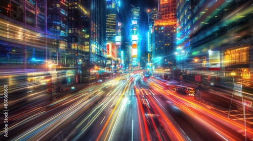 Illuminated Urban Majesty - A Vibrant Cityscape with Skyscrapers and Light Trails Capturing Dynamic Urban Life at Night